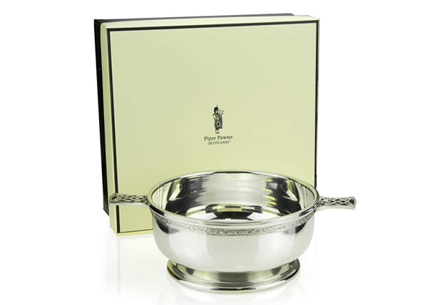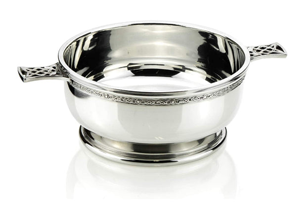 The quaich (pronounced quake) is the traditional Scottish cup of friendship. This work of art is made from British made polished pewter. It features Celtic knotwork designs on the handles and band around the outer surface of the bowl. Information on the background of the Scottish quaich is included.